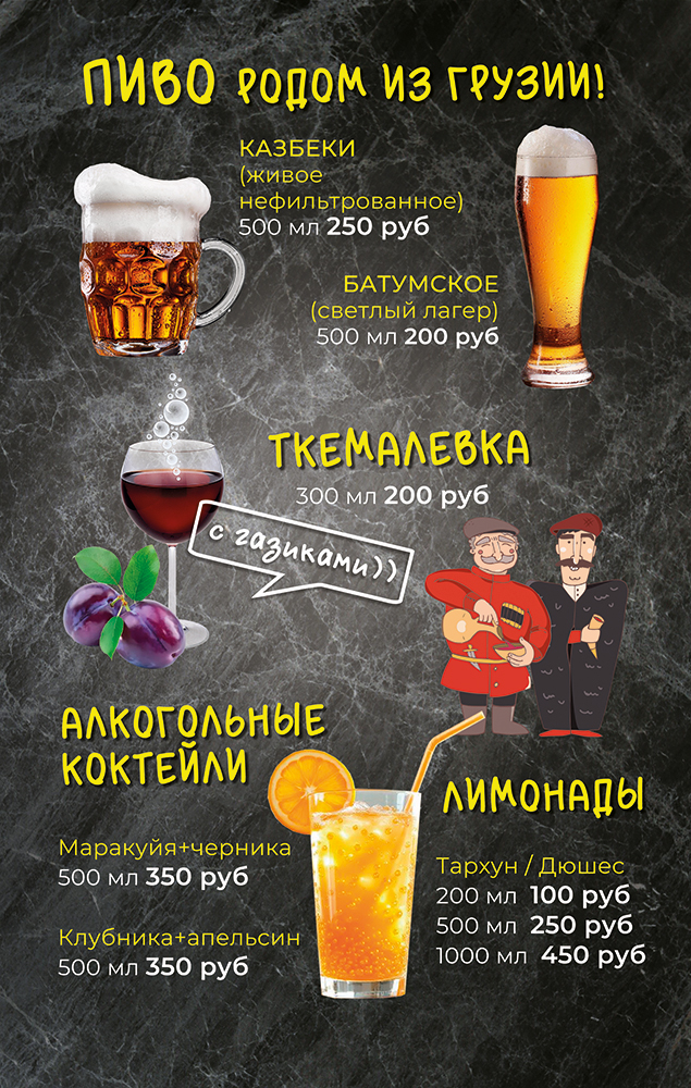 Гостей здесь ждет невероятное меню с блюдами грузинской и русской кухни, разнообразием шашлыков. А шеф-повар, периодически преподносит гостям на пробу новинки и радует спецпредложениями.